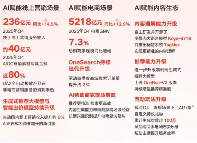 雷递网 乐天 3月26日快手今日发布2025年第四季度及全年业绩,在晚间的业绩电话会上,快手科技创始人兼首席执行官程一笑就可灵AI的竞争态势、公司2026年AI投入方向,以及电商和线上营销业务的新增