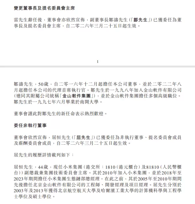 金山云近日在港交所发布重要人事变动公告,公司原非执行董事雷军因工作重心调整,已正式辞去相关职务,该决定自3月25日起生效。此次变动不仅涉及非执行董事职位,雷军同时卸任董事长、董事会提名委员会主席及薪酬委员会成员等核心职务,标志着其全面退出金山云管理层。