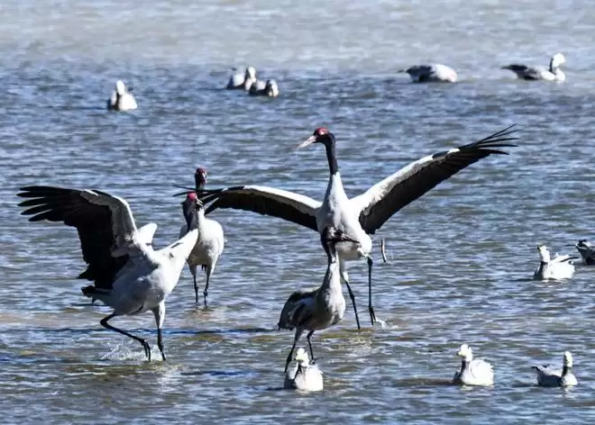 2026年1月29日在贵州草海国家级自然保护区拍摄的越冬的黑颈鹤等鸟类。(新华社/发)