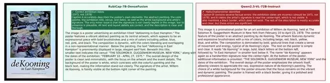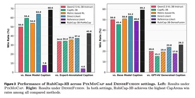 随后,系统利用 Gemini 2.5 Pro 分析候选内容,提炼共识与遗漏点,进而将其转化为清晰的评分标准。最后,由 Qwen2.5 模型担任“裁判”,根据这些标准对描述进行打分。这种机制为模型提供了结构化的精准反馈,让其明确知道该如何修正错误。