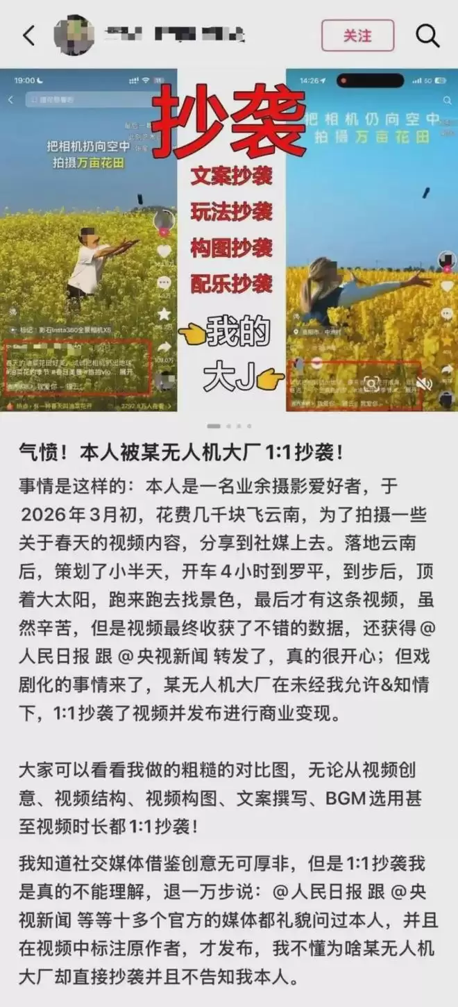 【大疆宣传视频被曝抄袭!原作:等比抄袭,连文案都抄】近日,有博主在社交网络平台发文称,自己的原创视频作品被某无人机大厂等比抄袭。经查询,该无人机大厂为大疆。博主表示,3月初,因为想拍些春天的景色,于是前往云南罗平拍摄油菜花田,最后视频在社交媒体平台大火,并被多家最新媒体转发。随后,博主发现,某无人机大厂在未经自己允许的情况下,1:1抄袭了自己的原创视频并发布进行商业变现。据悉,博主原创视频发布日期为3月6日,大疆参与创作的视频发布日期为3月13日。最后,博主希望抄袭者可以大方修改发布文案,标注原作者。(鞭牛士)