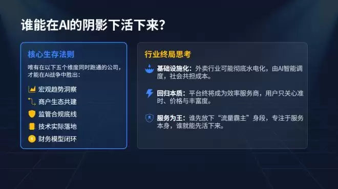 800亿补贴烧完了。但真正的战争——AI时代的外卖战争——才刚刚开始。这一次,战场是数据、算法、劳动力、监管、商户的生存线。谁能活下来?不是补贴最多的公司,也不是技术最牛的公司,而是能在宏观趋势、商户生态、监管合规、技术落地、财务模型五个维度同时跑通的公司。