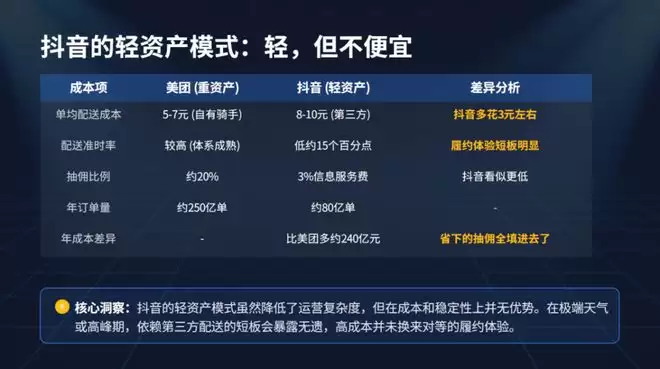 美团虽面临骑手短缺,但凭借自研大模型灵犀的极致调度和自有运力,依然保持了85%的准时率,却因人力成本飙升导致单笔亏损扩大。