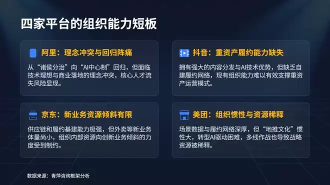 美团的优势是场景最全、数据最多、履约网络最强。但组织惯性最大——过去十年靠地推铁军打天下,现在要切换到AI产品经理模式,团队能转过来吗?同时,美团在五个战场防守,资源被稀释,AI投入能跟上吗?王兴要求员工减少哥味,推动组织扁平化,但扁平化不等于AI化。