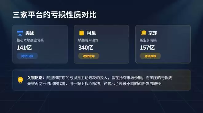 但最大的区别在于:阿里和京东的亏损是进攻成本,美团的亏损是防守代价。