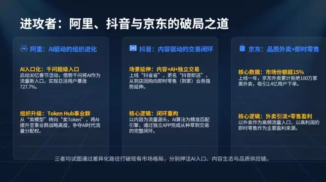 京东2025年2月高调入局外卖,阿里整合饿了么与淘宝闪购,抖音切入到店业务。美团被迫多线作战——守住外卖主战场、补上即时零售短板、扛住到店酒旅冲击、应对AI入口争夺。