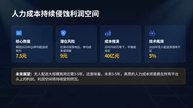 人力成本也在逐年攀升。以美团为例,2025年Q3单均配送成本约7.5元。如果社保参保全面落地,单均成本可能突破9元。按日均7000万单计算,仅配送成本一项,美团每年就要多支出近40亿元。而无人配送在2026年的渗透率仍不足5%,大规模商用还需3-5年。这意味着,未来3-5年,人力成本将持续侵蚀外卖平台的利润空间。