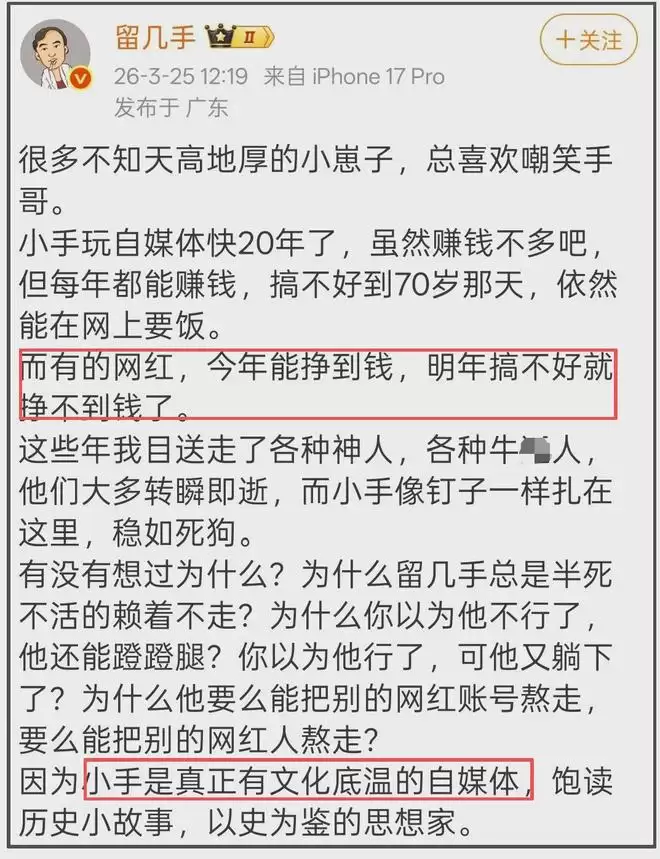 网络终归是有记忆的,看到留几手如此毫无底线的评价逝者,有网友想起了他曾对爱国者付国豪的评价。当年付国豪被歹徒围殴侮辱,留几手嘲讽付国豪为版面博出位。当付国豪去世消息公开后,他又用“网络对他的评价很复杂”岁月史书,明明当年的舆论方向都是谴责暴徒,至于付国豪的争议都是类似留几手这样的博主掀起的。