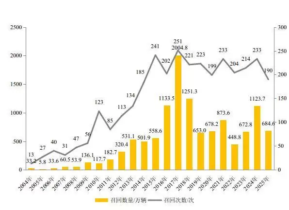 近日,市场监管总局发布关于2025年全国汽车和消费品召回情况的通告。数据显示,2025年全国共实施汽车召回190次,涉及车辆684 6万辆,同比分别下降18 5%和39 1%。具体来看,实施新能源汽