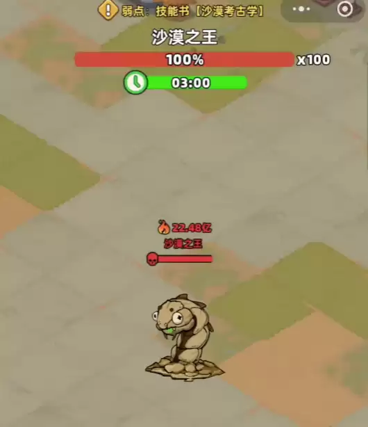 从首领的信息可知,游戏化的界面下,沙漠之王表面上是温和的,实际上非常危险。系统明确标出它的弱点是技能书【沙漠考古学】,这就意味着玩家在组建队伍的时候,应该先选择具有该技能或者类似属性克制效果的队员上阵。利用弱点攻击会提高百分比伤害,也可以破坏BOSS部分蓄力动作,从而减少战斗风险。除了上述情况外,从上图可知蝎子王、鬼夫人在上面,沙漠之王在下面,因此沙漠之王的血量是其他三个人血量总和的两倍多,也就是说沙漠之王战斗节奏更偏向消耗型,给玩家续航能力和资源储备带来了很大的压力。