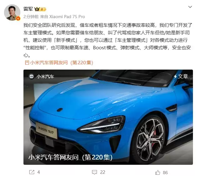 对此小米创办人,董事长兼CEO雷军在社交平台回应称如果您需要借车给朋友、叫了代驾或您家人开车但他/她是新手司机,建议使用「新手模式」,您也可以通过「车主管理模式」对各模式动力进行“性能控制”,也可限制最高车速、Boost模式、弹射模式、大师模式等,安全也安心。