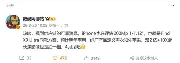 值得关注的是,这一影像方案将在OPPOFindX9Ultra上先行采用。这意味着在顶级影像产品的定义与节奏上,以OPPO为代表的国产手机厂商已经领先了苹果公司整整一年时间,占据了市场先机。