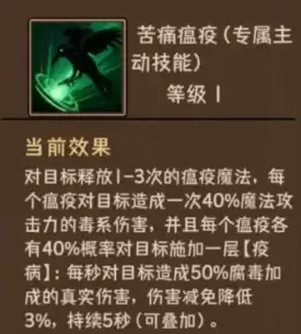 最后在毒系里面法师可以用到的是苦痛瘟疫这个技能,相对来说是可以用来做连击效果的,因为使用这个技能可以对敌人释放1~3次的瘟疫魔法,这个魔法释放的次数也是按照目前大家积攒的能量来看的,以及每个回合里面大家可以行动的次数,都是会影响这里释放瘟疫魔法的次数,每一个唯一效果对目标造成输出的时候,都会带来40%的魔法攻击,而且此时造成的毒性伤害当中,有40%的概率可以对敌人施加一次疫病,每秒对目标造成50%腐毒增加的时候,他对敌人造成的都是真实类型的伤害,这里伤害减免可以降低对面带来3%的攻击效果。