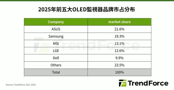 IT之家 3 月 26 日消息,TrendForce 今日表示,根据该机构最新调查,2025 年全球 OLED 显示器出货量达 273.5 万台,同比增幅 92%;而 2026 年有望进一步增长 51%。