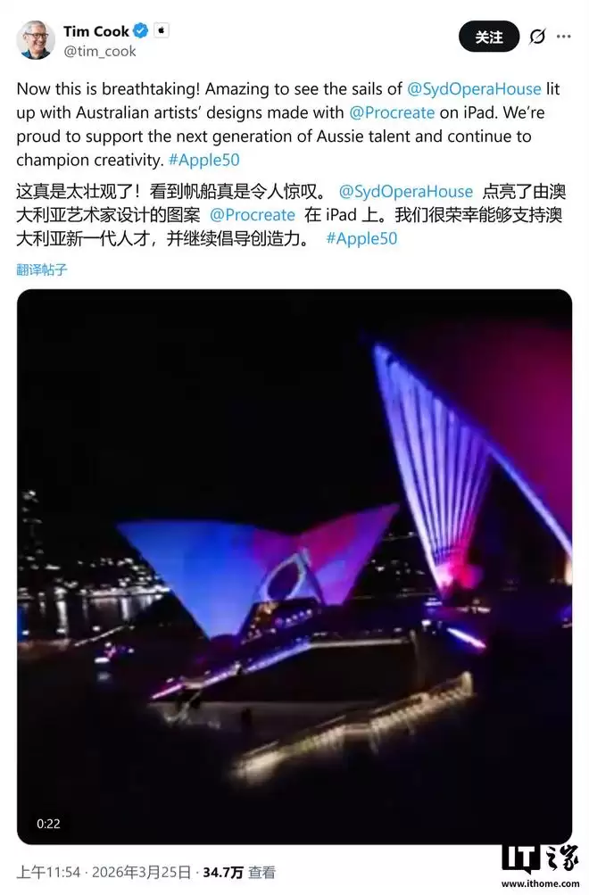 苹果库克盛赞:艺术家与公众共创,iPad绘出悉尼歌剧院最美夜景