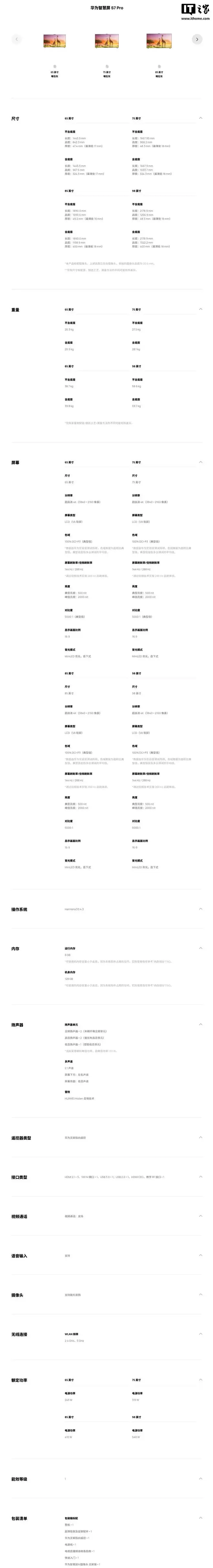IT之家附华为智慧屏 S7 Pro 参数如下: