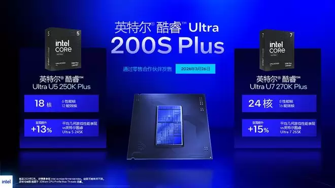 PChome 3月26日消息,英特尔酷睿Ultra 200S Plus处理器现已上市,酷睿Ultra 7 270K Plus到手价2499 元、酷睿Ultra 5 250K Plus到手价1699元