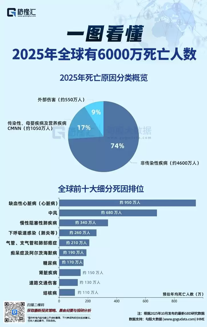 格隆汇3月26日|2025年10月发布的最新GBD研究数据显示,2025年全球死亡人数约为6000万人。在全球人口老龄化与气候变化挑战并行的背景下,死亡原因呈现出明显的结构性特征。其中,非传染性疾病(慢性病)占比约74%,作为全球首要死因,心血管疾病(如缺血性心脏病、中风)位居前列。