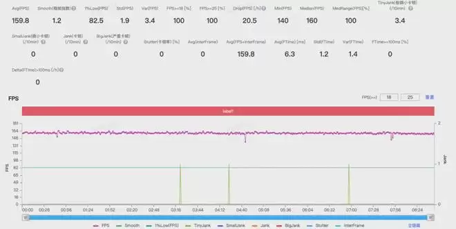 在《使命召唤手游》中,iQOO Z11 跑出了 159.8FPS 的成绩,虽然没能顶满 165FPS,但帧率曲线较为稳定,1% LOW 帧更是接近一条直线,属于令人满意、但不够极致的水平。