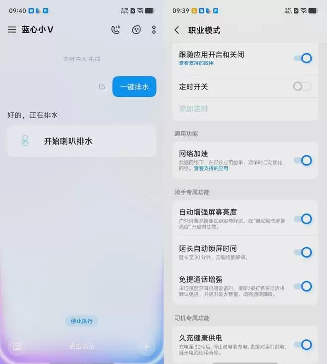 长时间户外使用,难免遇到风吹雨淋,iQOO Z11 支持 IP68/IP69 满级防尘防水,还配备一键排水清灰功能,对蓝心小 V 语音指令即可开启,十分方便。