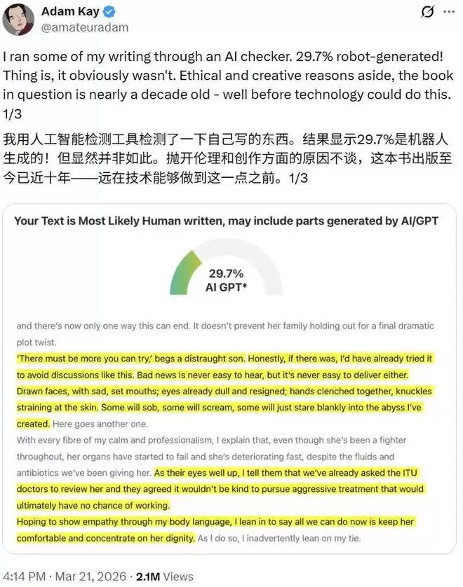 前两天,知名畅销书作家 Adam Kay 在社交媒体 X 分享了自己的经历:他心血来潮,把自己的作品丢进一款 AI 检测器里查重,结果系统信誓旦旦地判定其中有 29.7% 的内容由机器生成。
