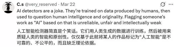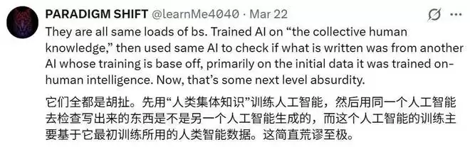 这位网友表示「这些东西本质上都是胡扯,先用人类的集体知识去训练 AI,然后又用同一个 AI 来判断一段内容是不是由 AI 生成的,而这个判断本来就建立在它最初训练所依赖的人类智能之上。说到底,这真的是一种相当荒诞的逻辑。」