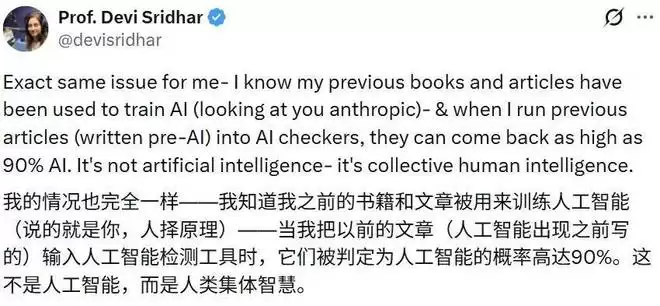 学术界可谓是这场误判的重灾区。比如爱丁堡大学全球公共卫生教授兼主任 Devi Sridhar 教授的以前的文章就被检测判定有 90% 的内容都是 AI 生成的。