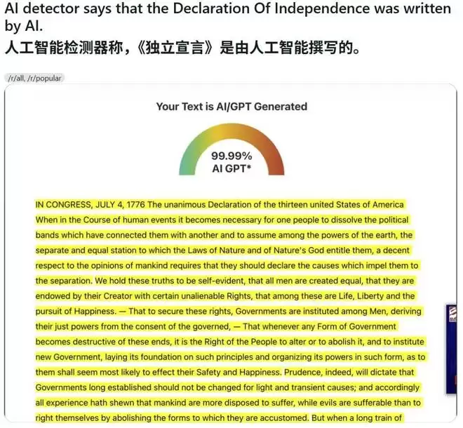 就连《独立宣言》也未能幸免,AI 检测器认为有 99.99% 的内容来自 AI: