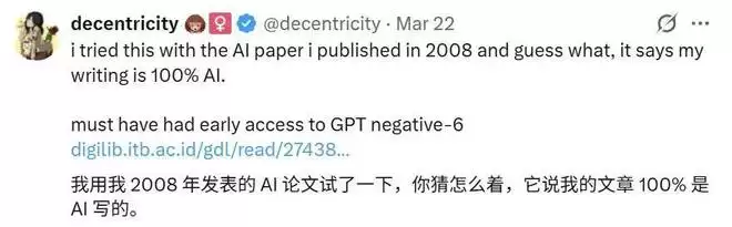 也有更多网友分享了自己的检测结果。比如网友 decentricity 用自己 2008 年的一篇关于 AI 的论文进行了检测,最终荣获 100% 纯 AI 生成的错误认证。这位网友调侃说自己用的是「GPT 负 6」。