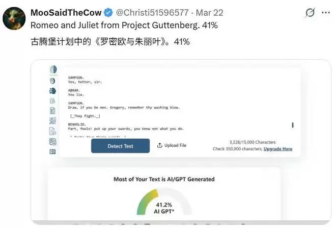还有更离谱的,就连经典的《罗密欧与朱丽叶》原著也被认为有 41% 的内容是 AI 生成的: