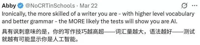 更是有网友指出,写作水平越高(词汇更丰富、语法更规范),反而越容易被检测工具判定为 AI 写的。