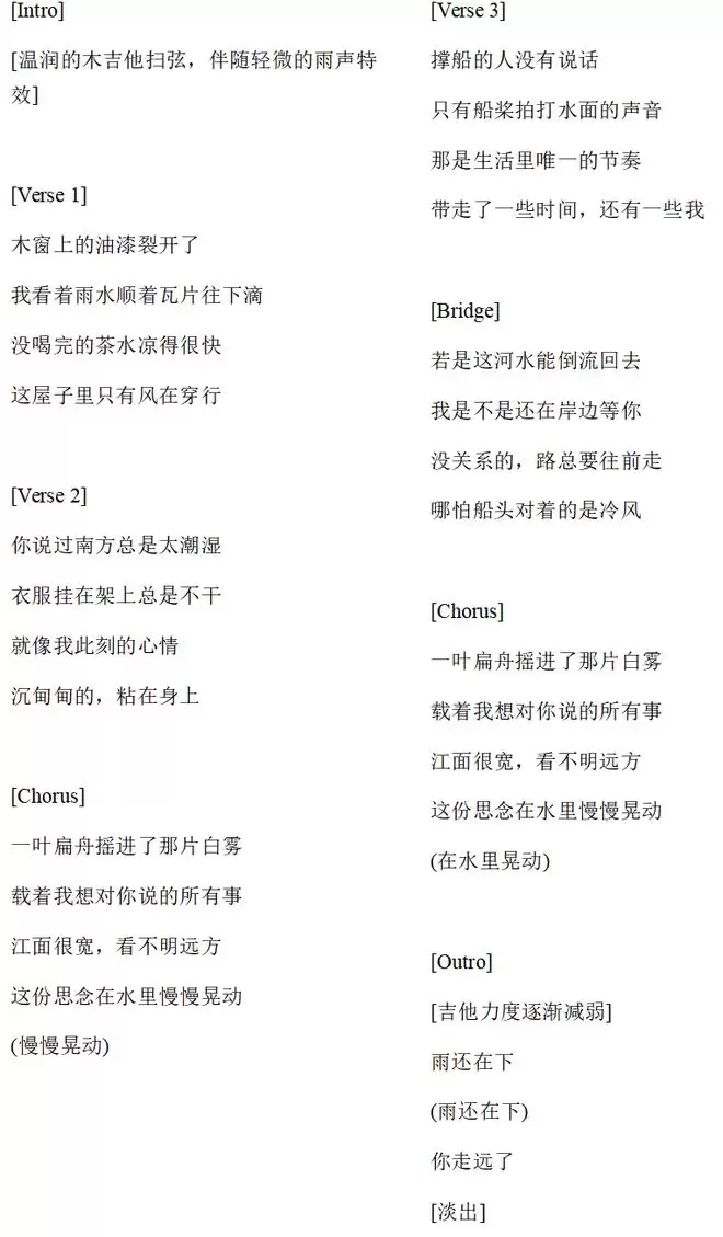 “创作一首抒情的国风中文歌曲,中低音女声,伴奏除了曲调外,可以加入笛子、古筝或琵琶,演绎要有情感”