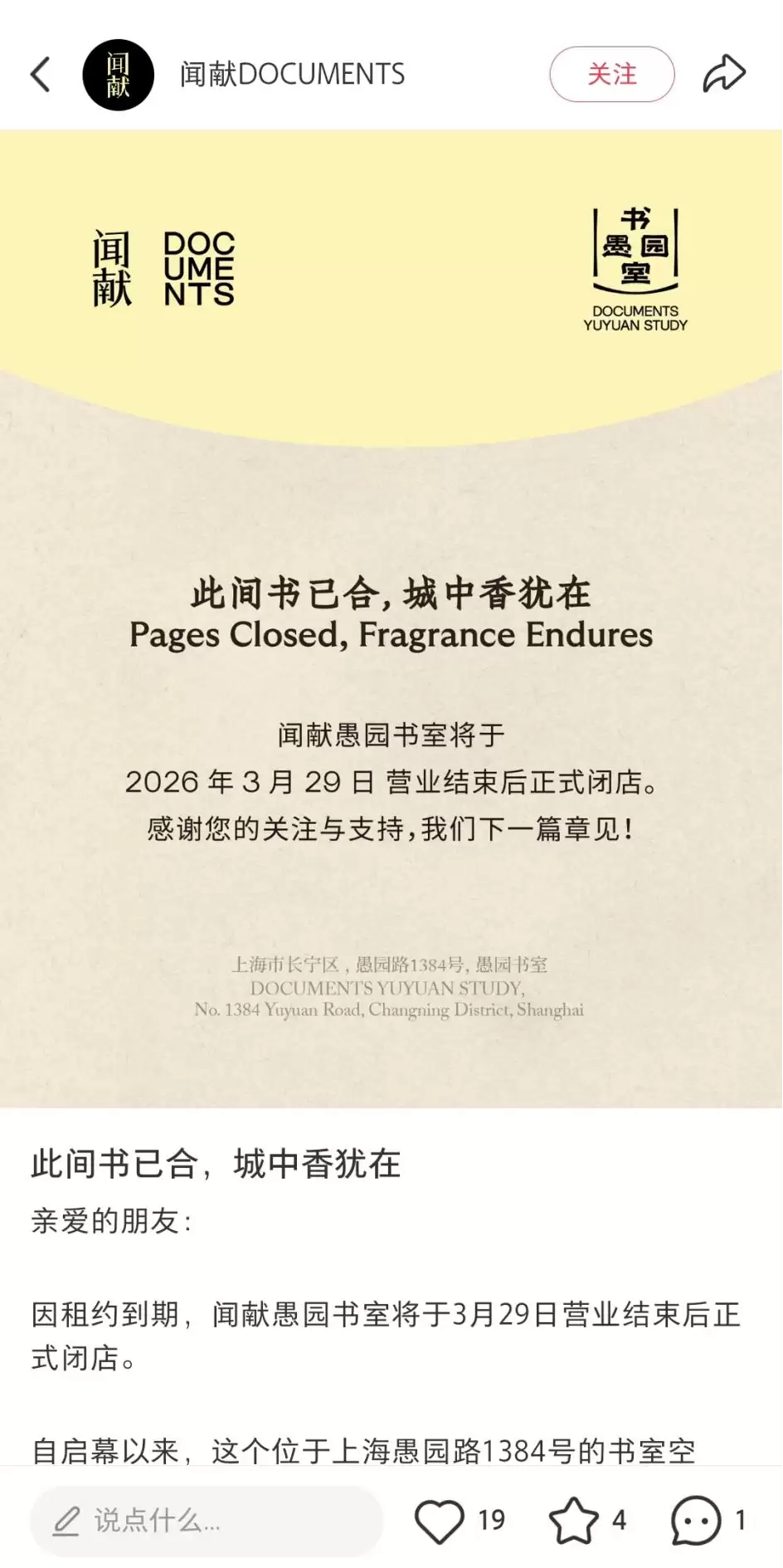 3月26日消息,3月23日,闻献最新账号发布消息:位于上海愚园路1384号的闻献愚园书室,将于2026年3月29日营业结束后正式闭店。闭店原因为“租约到期”。这家于2024年5月1日正式开业的门店,运营至今还未满3年。