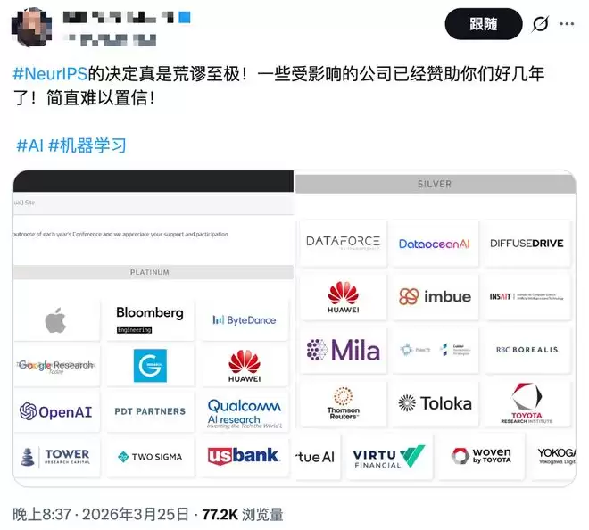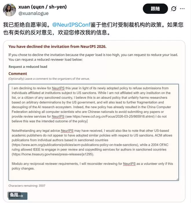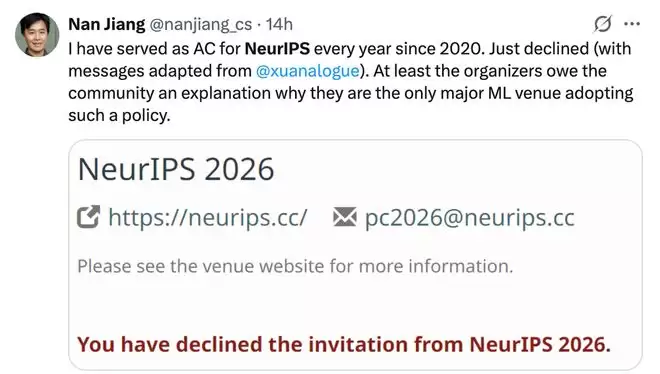强化学习研究者姜楠(Nan Jiang)则直言,自己自2020年以来每年担任NeurIPS AC,今年已决定拒绝,并指出主办方至少应向社区解释为何成为“唯一采取这一政策的顶会”。
