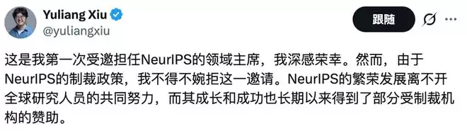 几乎没有缓冲期,这一规则很快在学术共同体内部引发“反击”。西湖大学助理教授修宇亮(Yuliang Xiu)公开发声:“这是我第一次受邀担任NeurIPS领域主席……但由于制裁政策,我不得不婉拒这一邀请。”他直言,NeurIPS的繁荣发展离不开全球研究人员的共同努力,而其成长与成功也长期以来收到了部分受制裁机构的赞助。