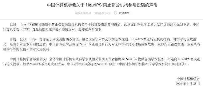 中国计算机学会在3月25日发布声明,明确指出NeurIPS相关政策违背开放、包容、平等、合作的学术基本原则,将学术交流政治化,并对全球学术共同体造成损害。
