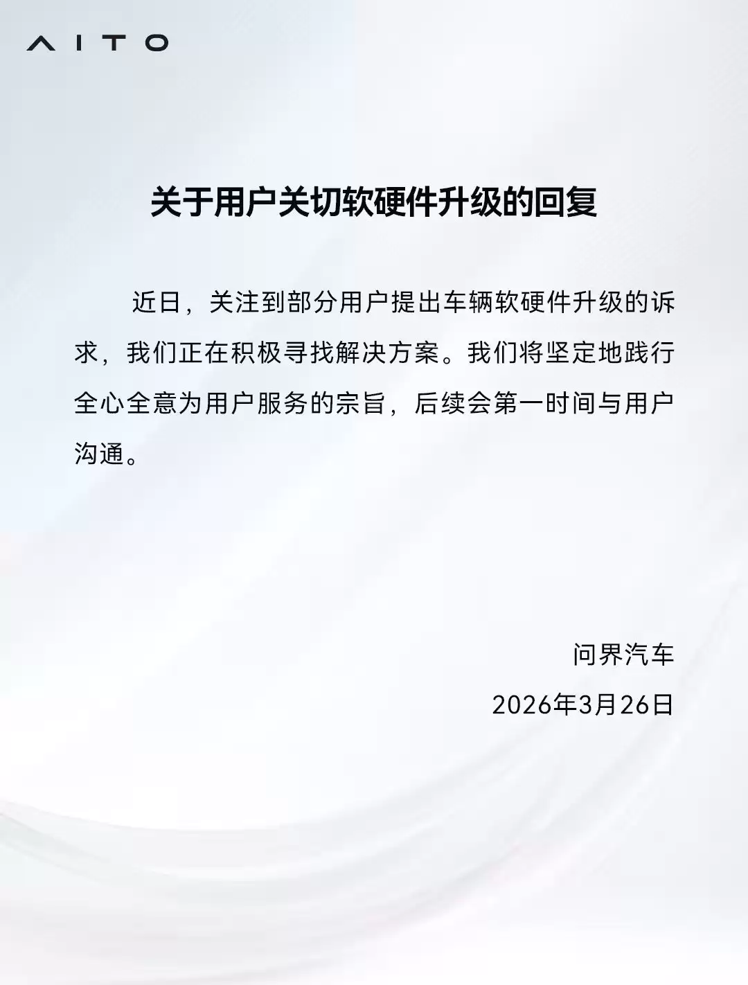 3月26日消息,问界用户服务公众号今日发布了《关于用户关切软硬件升级的回复》,称正在积极寻找解决方案。