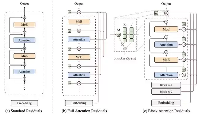 注意力残差概述。(a)标准残差:采用统一加法累加的方式进行的标准残差连接;(b)全注意力残差:每个层通过学习到的注意力权重有选择地整合所有前一层的输出;(c)块注意力残差:将层分组成块,从而将内存消耗从 O(Ld) 减少到 O(Nd)。图源:《Attention Residuals》