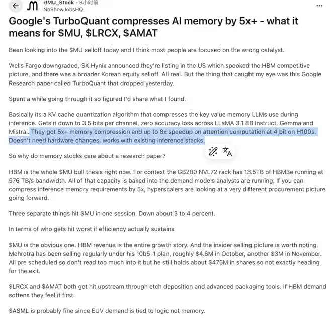 TurboQuant论文发布后,市场给出了非常迅速的反应——前段时间因为HBM而大幅上涨的存储芯片股(详见《》)在今天应声下跌。很多人认为AI芯片将不再需要那么大的内存了,HBM的叙事将走弱,AI芯片的“内存墙”也将被绕过。
