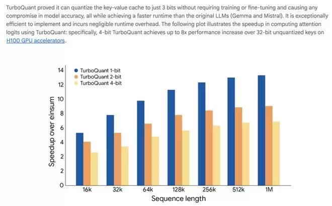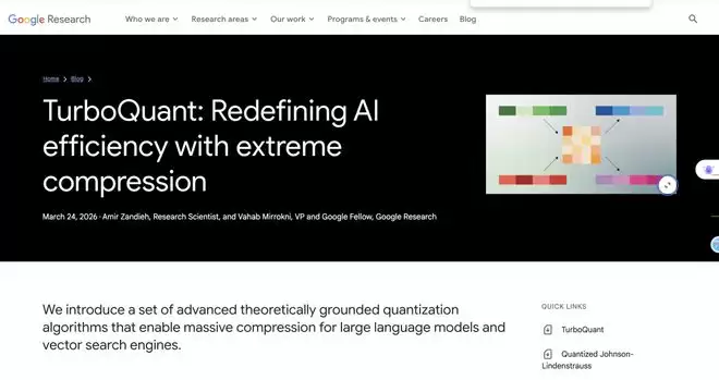 在TurboQuant的发布博客上,谷歌最新用几个数据描述了这个新算法的有效性——“3bit无损”、“8×加速”、“6×压缩”、“零预处理”。