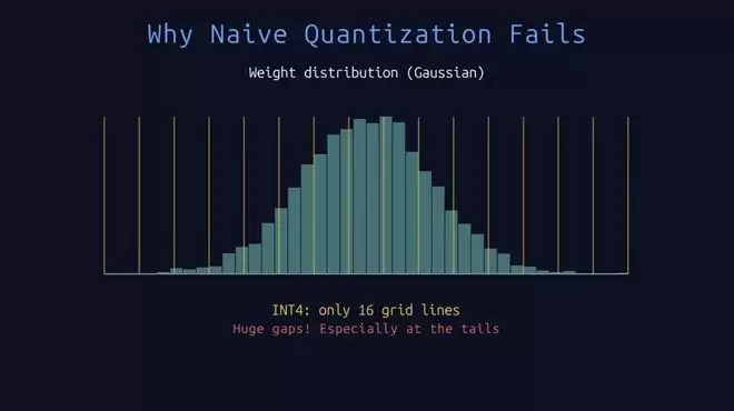 量化前后的模型权重分布,INT8精度下有256条网格线,INT4精度下却只有16条网格线。图源:Toutube @Tales Of Tensors 《LLM Quantization Explained: GPTQ, AWQ, QLoRA, GGUF and More》