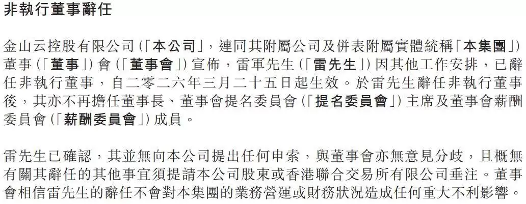港股上市公司金山云近日发布重要人事变动公告,自2026年3月25日起,雷军将不再担任公司非执行董事及董事长职务。这位自2012年金山云创立之初便深度参与的科技领袖,在执掌公司11年后选择卸任。公告特别强调,此次调整系雷军基于个人工作安排的主动选择,与董事会不存在任何分歧,且不会对公司运营产生实质性影响。