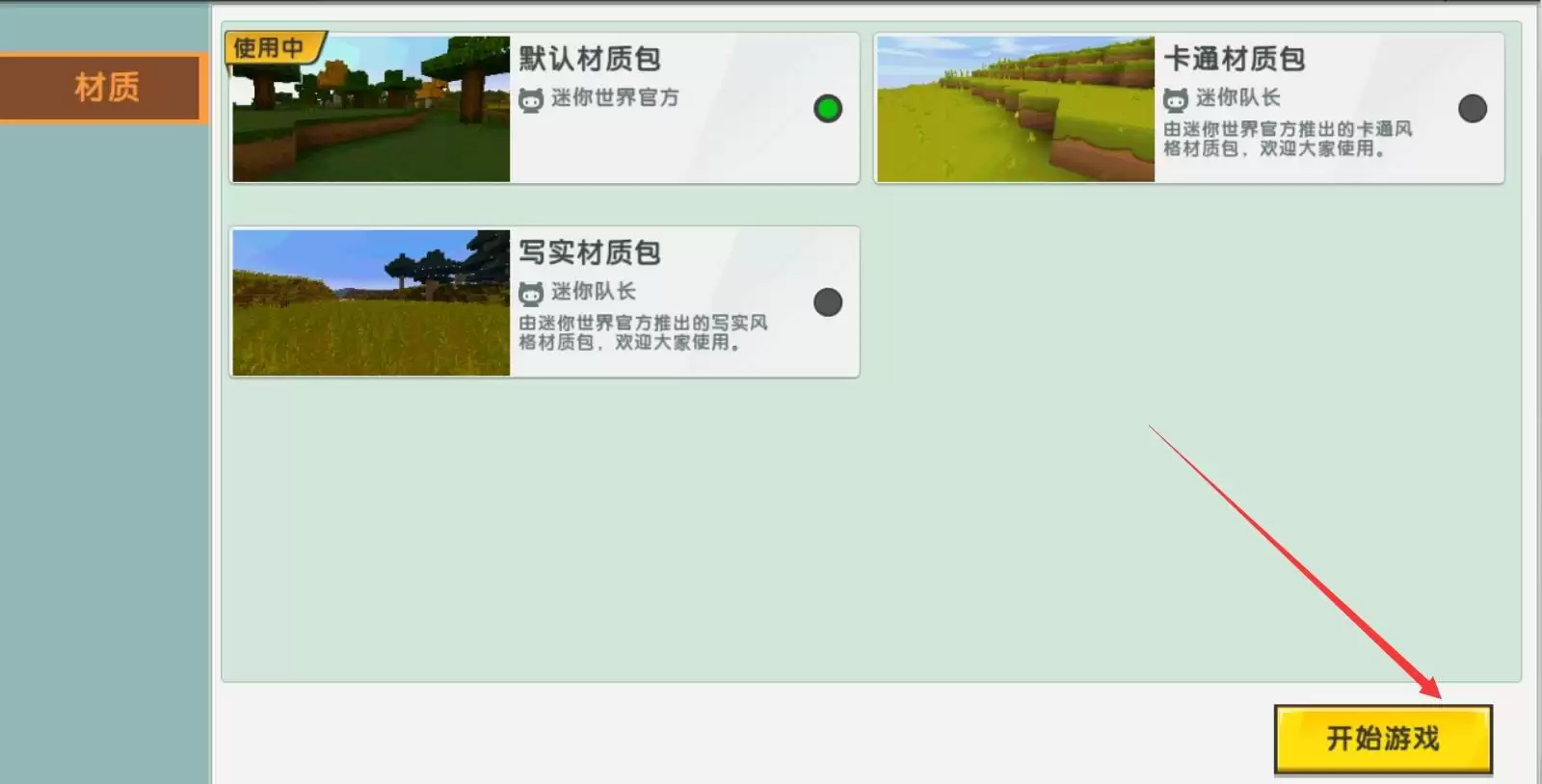 4,然后选择对应的材质包点击开始游戏即可。