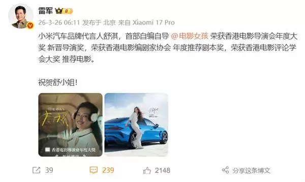 舒淇转型导演首作《女孩》揽大奖,雷军发文祝贺
