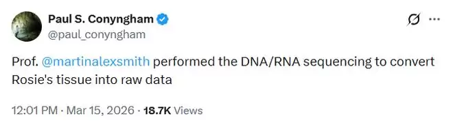 根据保罗在X平台发布的帖文:Martin Smith博士进行了DNA/RNA测序,将Rosie的生物组织转化为可分析的原始数据,Palli Thordarson教授则带领团队完成mRNA疫苗的设计与组装。Palli Thordarson教授本人也在社交平台上证实了这一点,并表示:“RNA技术、基因组学与AI的交汇,为医学实践带来了改变的可能,也让医疗更加公平。”