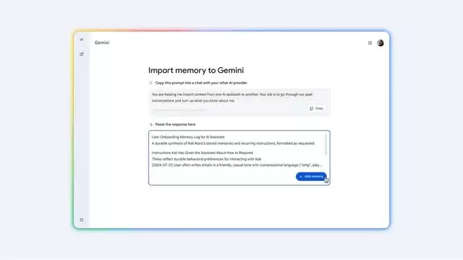 将记忆从其他 AI 应用导入 Gemini 的操作方式如下:进入设置页面,选择新增的导入选项。系统会提供一个建议的提示词,用户可以将其复制并粘贴到当前使用的 AI 应用中。待原应用生成一份关于用户偏好的摘要后,只需将该回复复制并粘贴回 Gemini。Gemini 便会即时分析这些信息,并将细节安全保存至用户的 Gemini 上下文中,供后续聊天时直接使用。