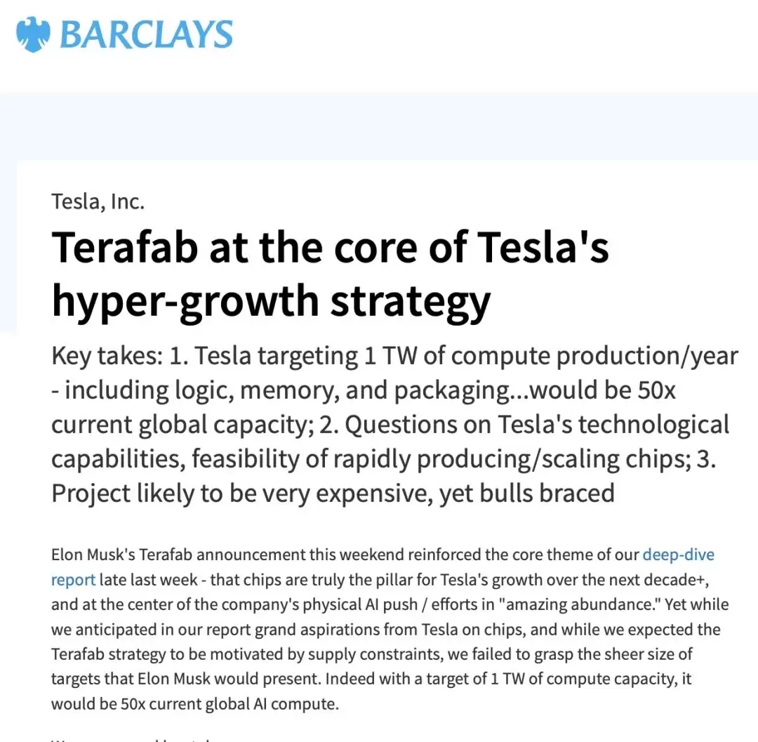 巴克莱汽车分析师Dan Levy等人本周发布了名为《Terafab是特斯拉超高速增长战略的核心》的报告,详细分析了特斯拉Terafab项目的可行性、潜在风险和挑战等。