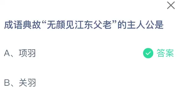 成语典故“无颜见江东父老”的主人公是?支付宝小鸡课堂开课啦!每天只需花一分钟,动动手指答对问题,180g饲料立马到账!不仅自家小鸡吃得饱饱的,还能顺便捐个爱心,一举两得!2026年3月27日蚂蚁庄园的小鸡课堂题目正确答案是【项羽】,成语典故“无颜见江东父老”的主人公是项羽