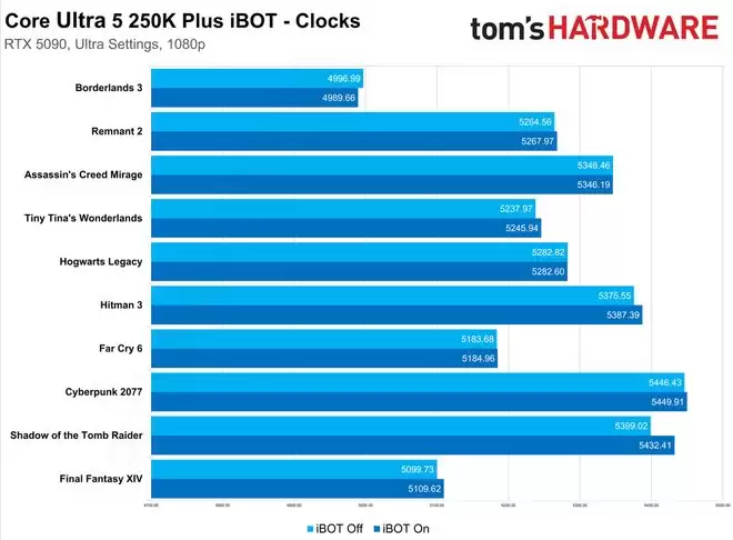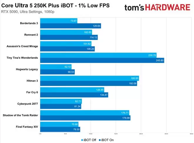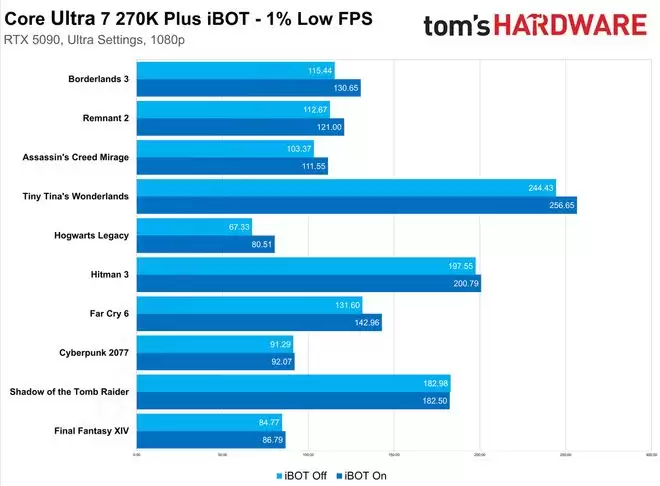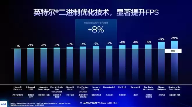 该媒体在酷睿 Ultra 200S Plus 系列处理器上,测试 10 款支持 iBOT 工具的游戏,发现启用后平均帧率提高约 8%。