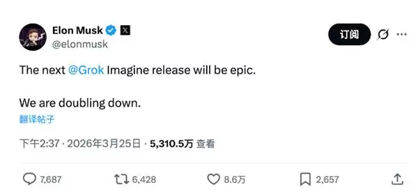 马斯克当天在X上发文称:"下一版Grok Imagine的发布将会非常震撼,我们正在加倍投入。"